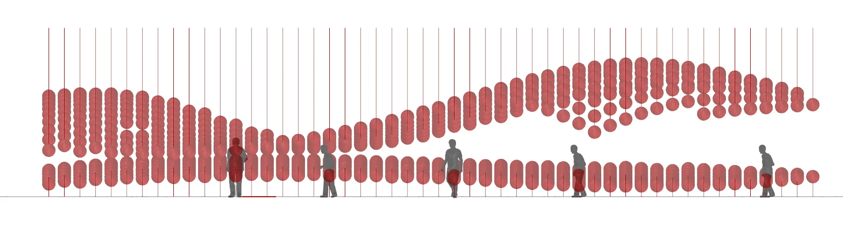 In plan, the balloons are arranged in a diagrid, so the occupant's path through the medium is never direct, and they can never really see where they are going. This results in moments of disorientation when one finds themselves in a 'valley', and surprise when they emerge into a 'cave'.
