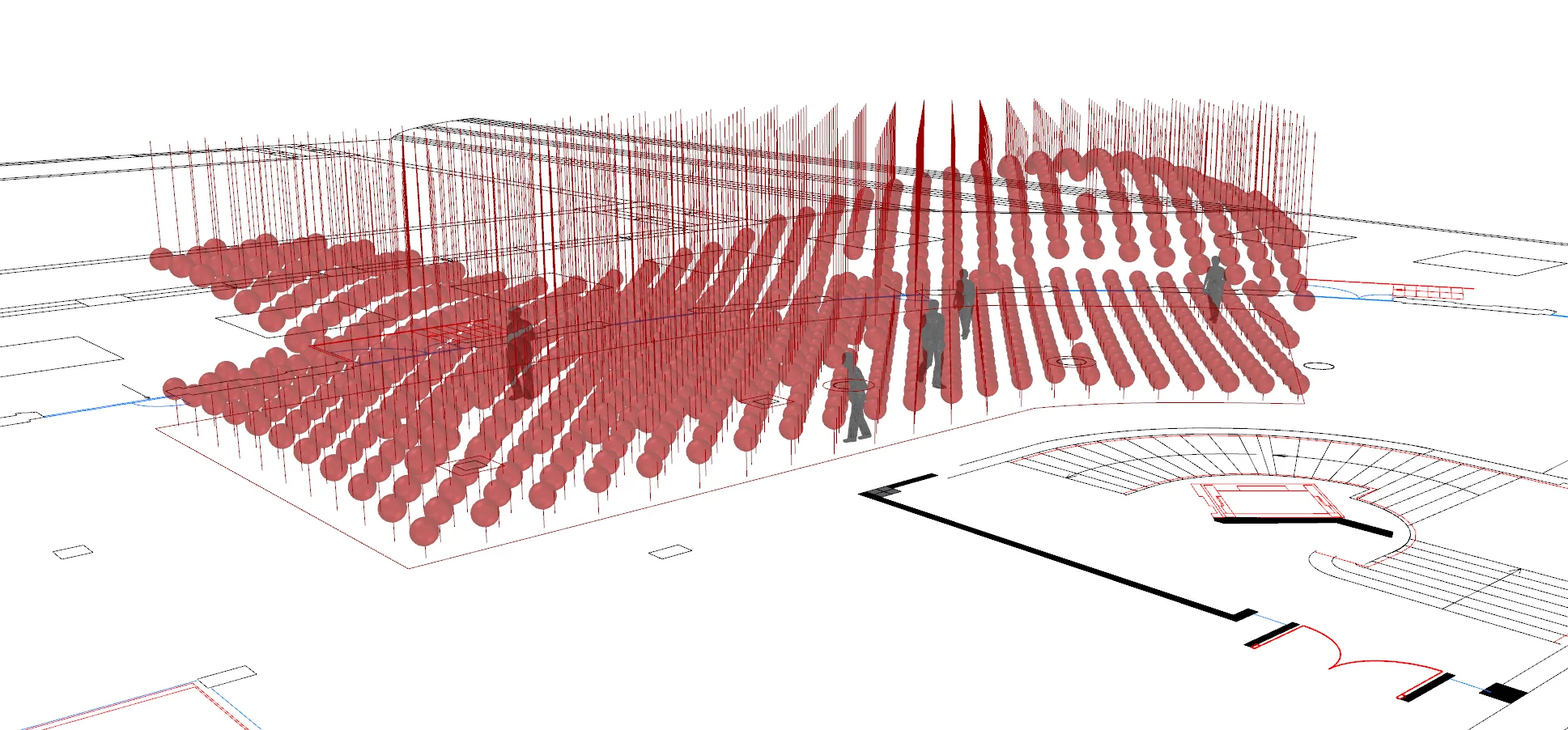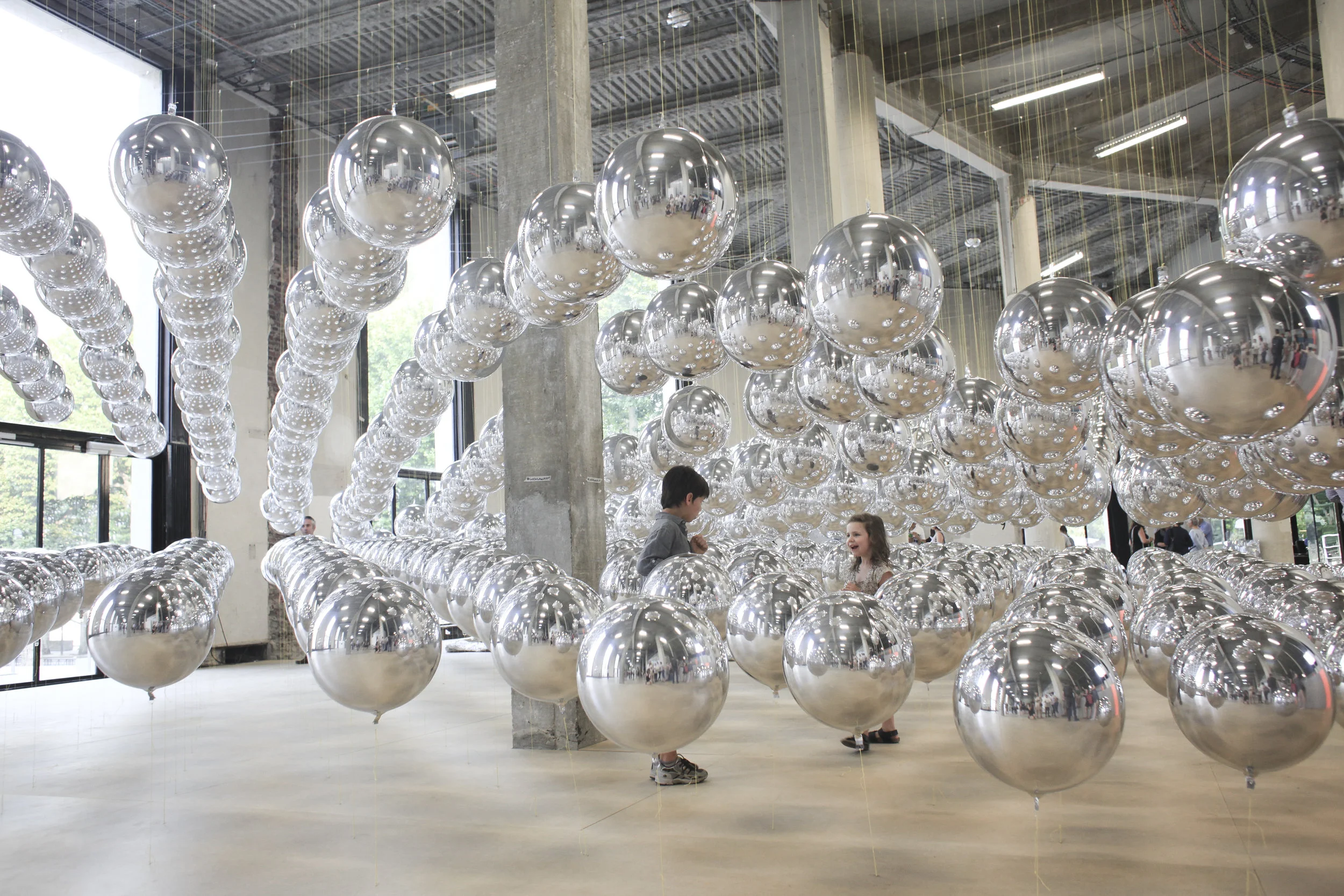 We were able to create tags for the two corresponding grids which contained 3 data points: Location, Top Length, Bottom Length. With these three data points we were able to number them according to install order, and then cut the fishing line to the corresponding lengths. Concurrently, the install team mapped the grid in the hair using cherrypickers and metal wire. Then a secondary team went through and with the help of plumb lines marked corresponding lower grid points. Finally a third team came through and inflated the balloons (one helium and one air), and attached them to the lines. Overall install took about 3.5 days, which I believe is extremely fast for a process this meticulous.