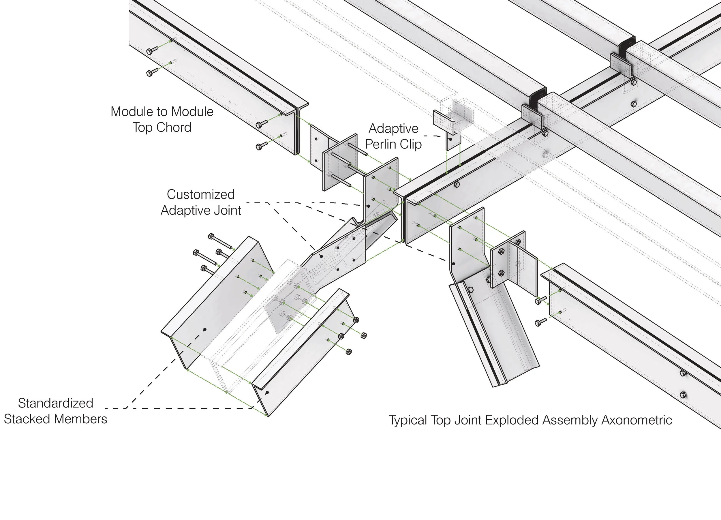 The parametric structural bay is conceived through a combination of standard stock steel extrusion members and custom, water-jet-cut connection plates. Sandwiching the plates between the steel extrusions and using them as hinges allows for geometric variability with minimal customized steel and provides repeatable, varied connection details for simple, efficient, shop-built construction.