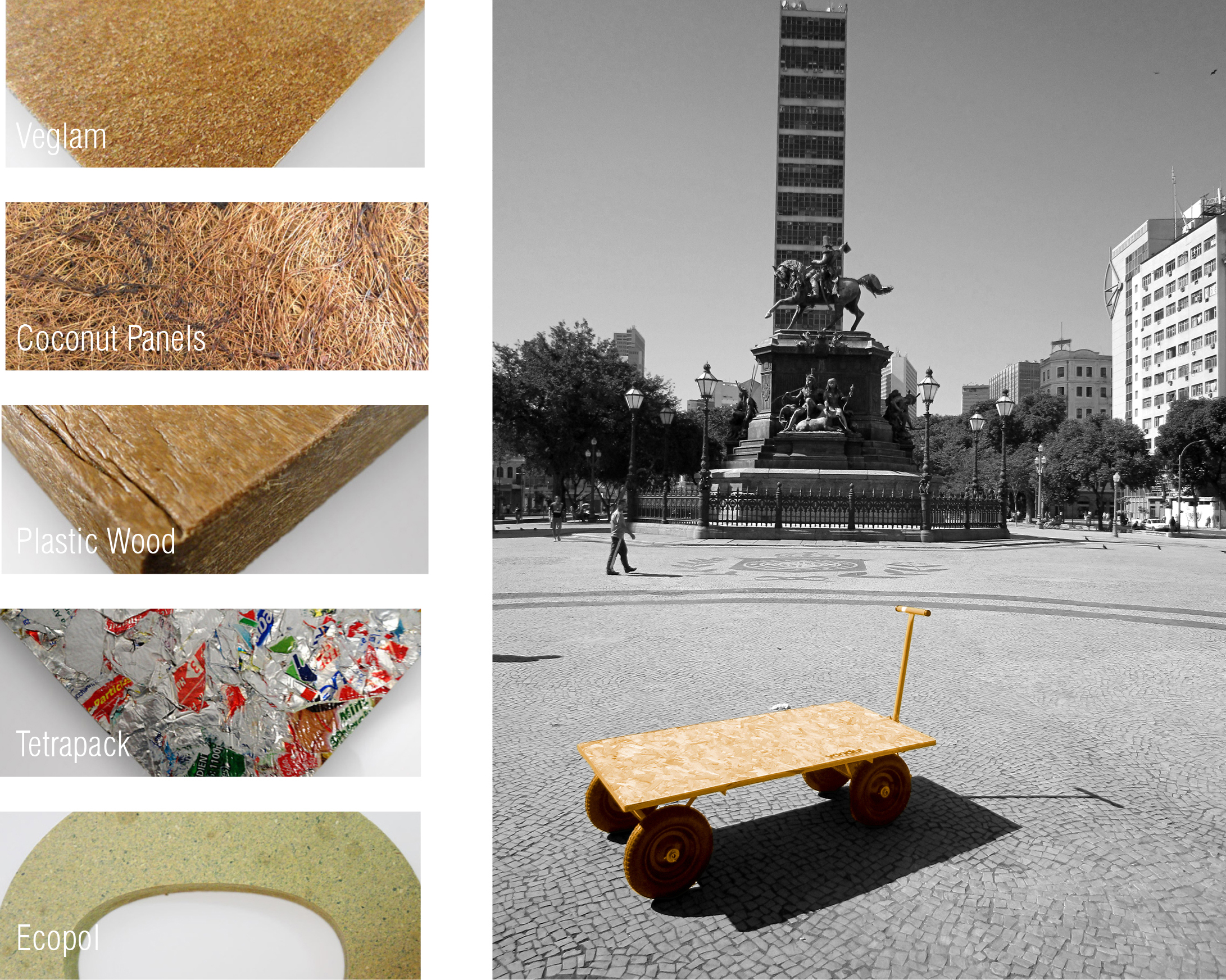 Inspired by the informal nature of commerce typical of Brazilian cities, we designed a set of flexible carts which can be deployed for staging events at Studio-X Rio. Each cart was given a required program to fulfill: projection +DJ/AV equipment cart, exhibition cart, and a bar cart. In addition we were challenged to use only the recycled materials provided to us by a local building materials company in order to promote sustainable practices.