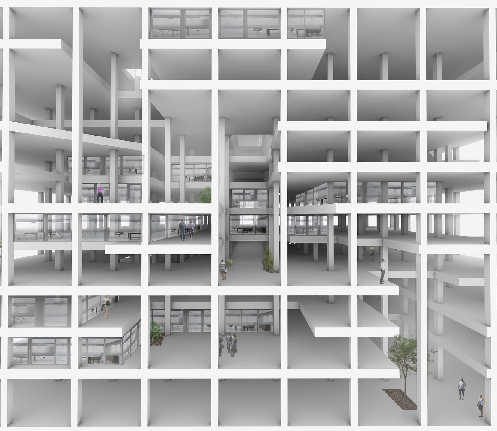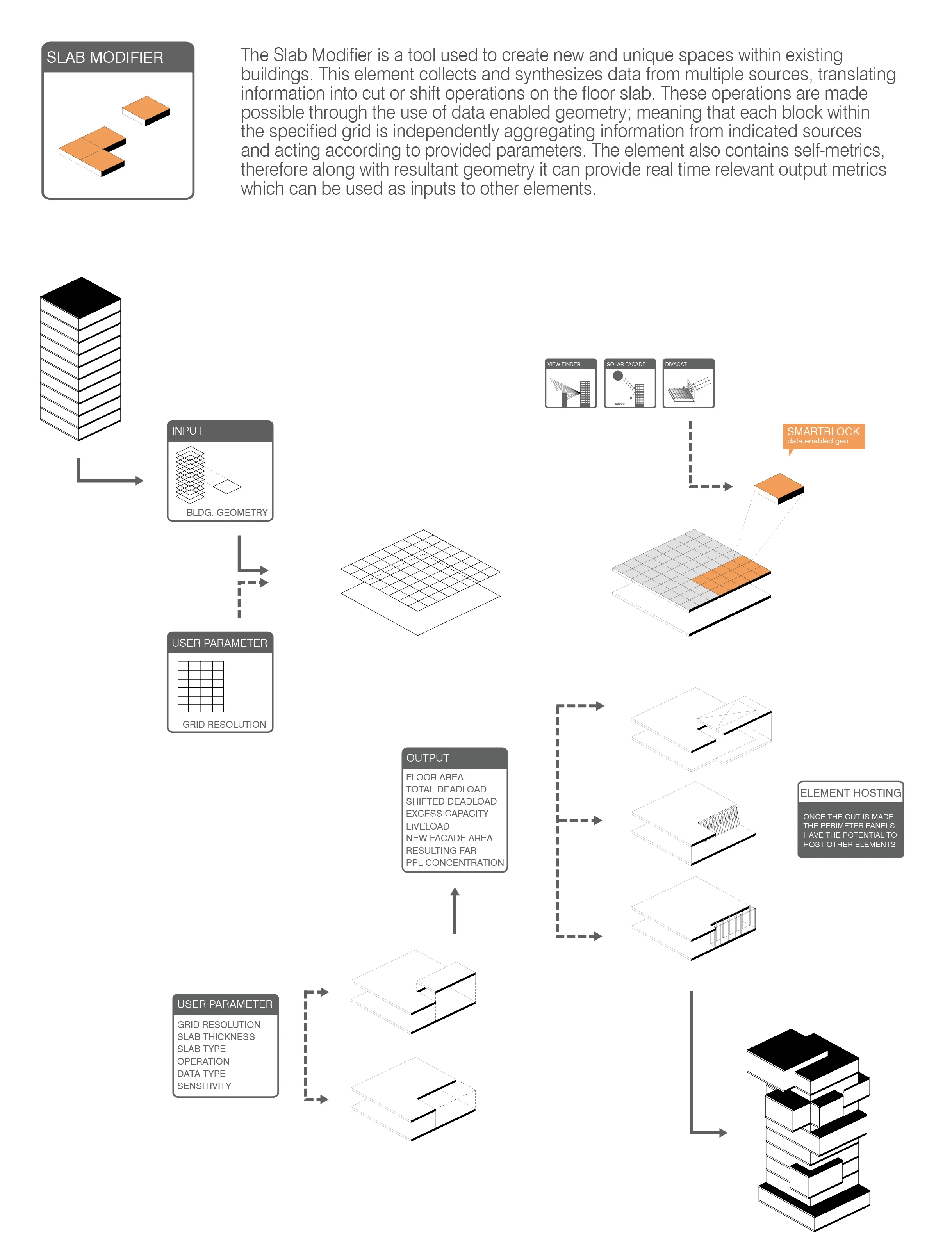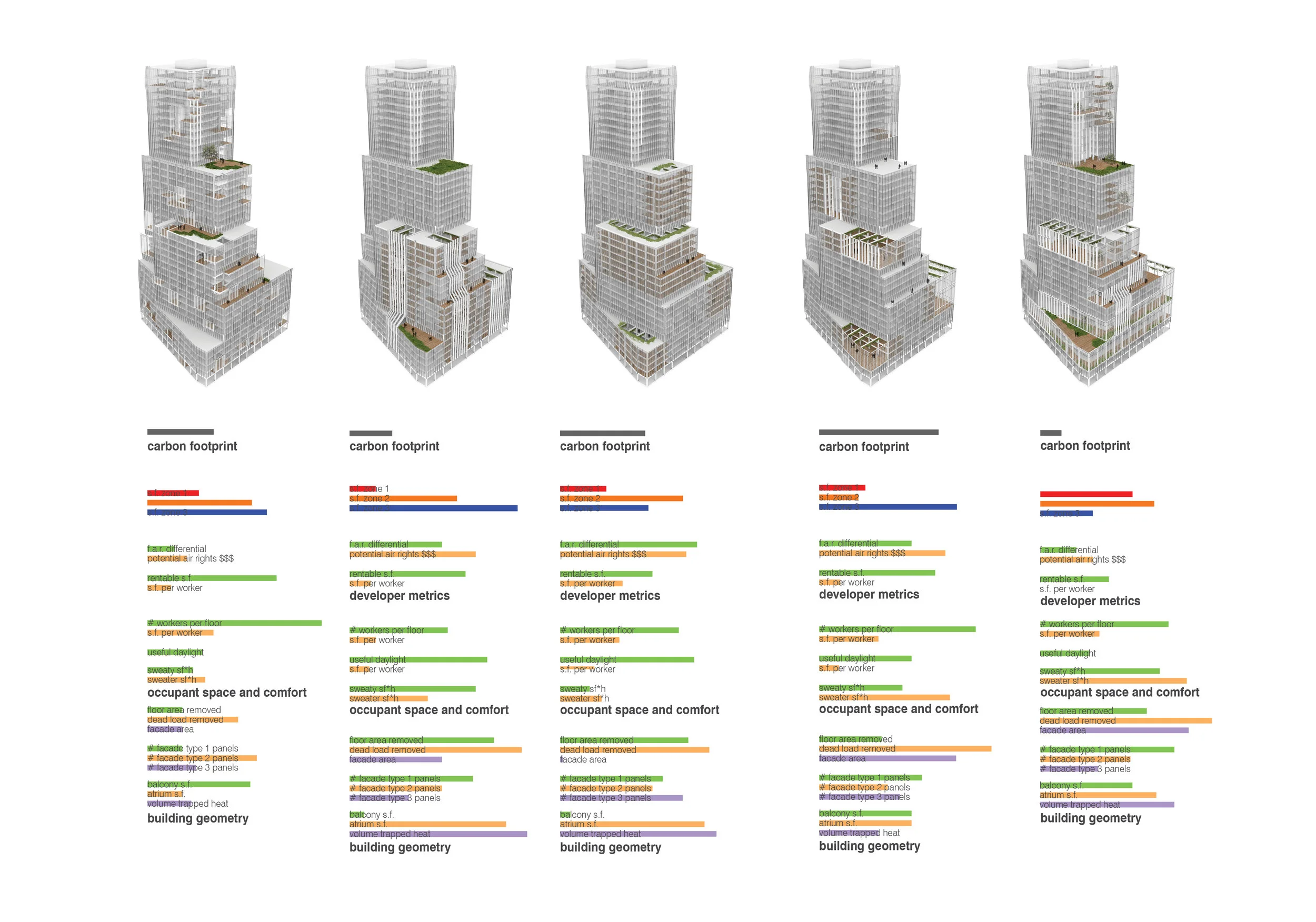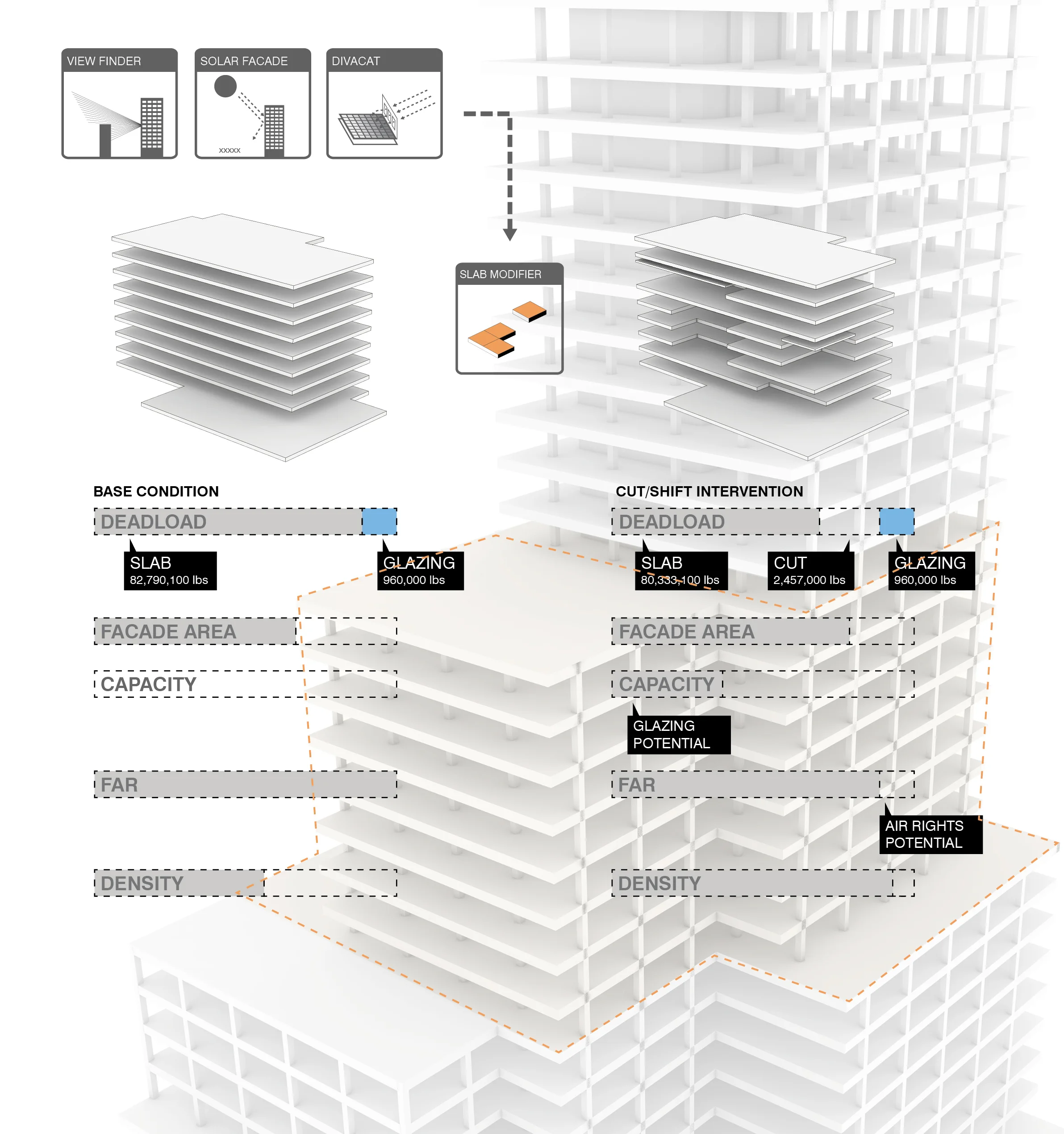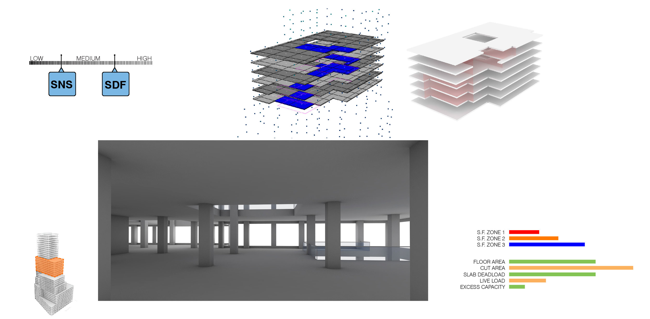 Given that each business has diverse needs, we aimed to create a retrofitting tool that would provide heterogeneity through spatial typology and microclimates - negotiated through the tradeoff of dead load in the slabs and facade - in order to improve employees daily routines and physiological working conditions.